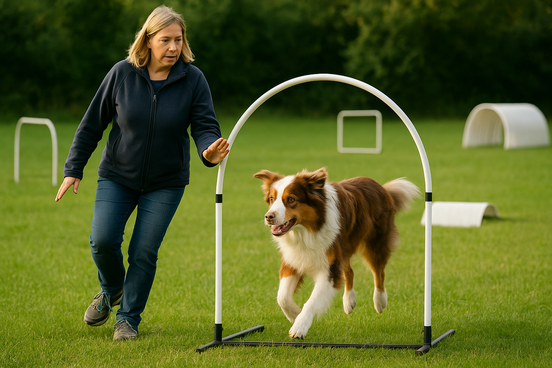 Hoopers ist eine moderne, gelenkschonende Hundesportart, bei der dein Hund auf Distanz durch einen Parcours aus Bögen (Hoops), Tunneln, Gates und Tonnen geführt wird. Dabei bleibt der Mensch in einem festgelegten Führbereich und leitet den Hund über Körpersprache, Sichtzeichen und verbale Kommandos.